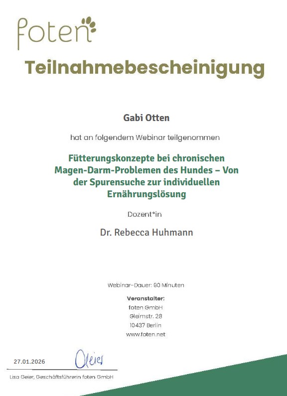 Des weiteren bin ich ein Teil des „Team Darmgesundheit“ von Maike John-Sauerstein ( Tierheilpraktikerin und Autorin des Buches „Darmgesundheit beim Hund“ ) Unser kompetentes Team besteht aus fünf Ernährungsberaterinnen, die sich alle auf die Magen-Darm-Gesundheit des Hundes spezialisiert haben. Unsere Patienten profitieren somit von geballten Fachwissen, unserer jahrelangen Erfahrung sowie einer engen Zusammenarbeit & dem intensiven Austausch im Team